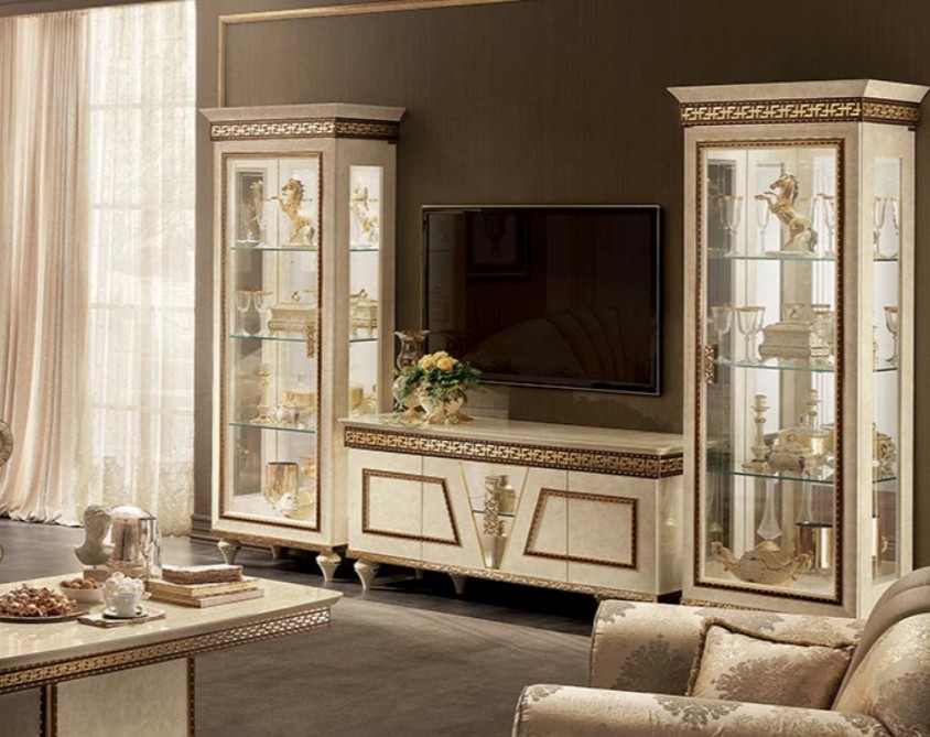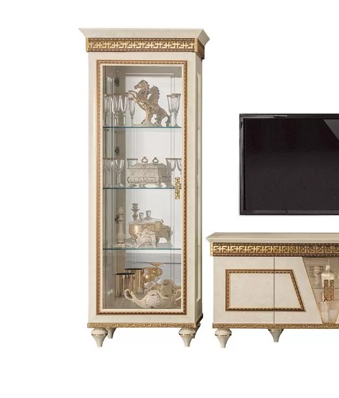 Витрина в зале, оформленном мебелью из коллекции Fantasia, создаёт максимальное сверкание в пространстве благодаря контрасту зеркальных бронзовых створок и позолоте центрального фриза. Изделие предлагается в трёхстворчатой, двустворчатой версии и с одной створкой, каждая из которых подчёркивает великолепный дизайн и подсветку всей гостиной Fantasia.
