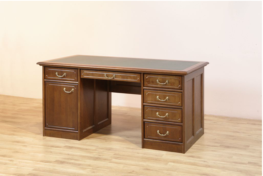 Ручки металлические под бронзу. Ящики выдвигаются легко и без усилий, направляющие – шариковые. Модель содержит две тумбы, одна тумба с дверкой, другая с четырьмя выдвижными ящиками, и с выдвижным ящиком между двух тумб.