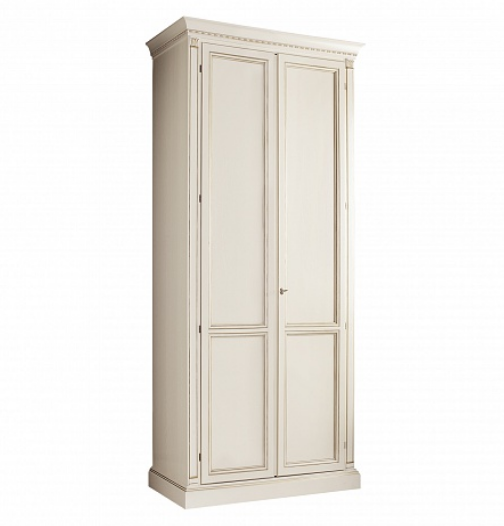 Высокий и грациозный двухдверный шкаф Венеция является эталоном классической спальни в итальянском стиле. Шпон ясеня, покрытый белым лаком и изысканный резной узор с позолотой, делают мебель Венеция одной из самых элегантных в Европе. Вместо обычных ручек дверцы шкафа запираются на замок. Это предотвращает случайное выпадение вещей.