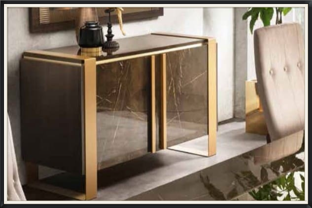 Изысканность коллекции обогащается металлическими элементами с сатинированной позолоченной отделкой: ручками тумбочек, опорами витрин, деталями столов для гостиной и мебели для спальни.