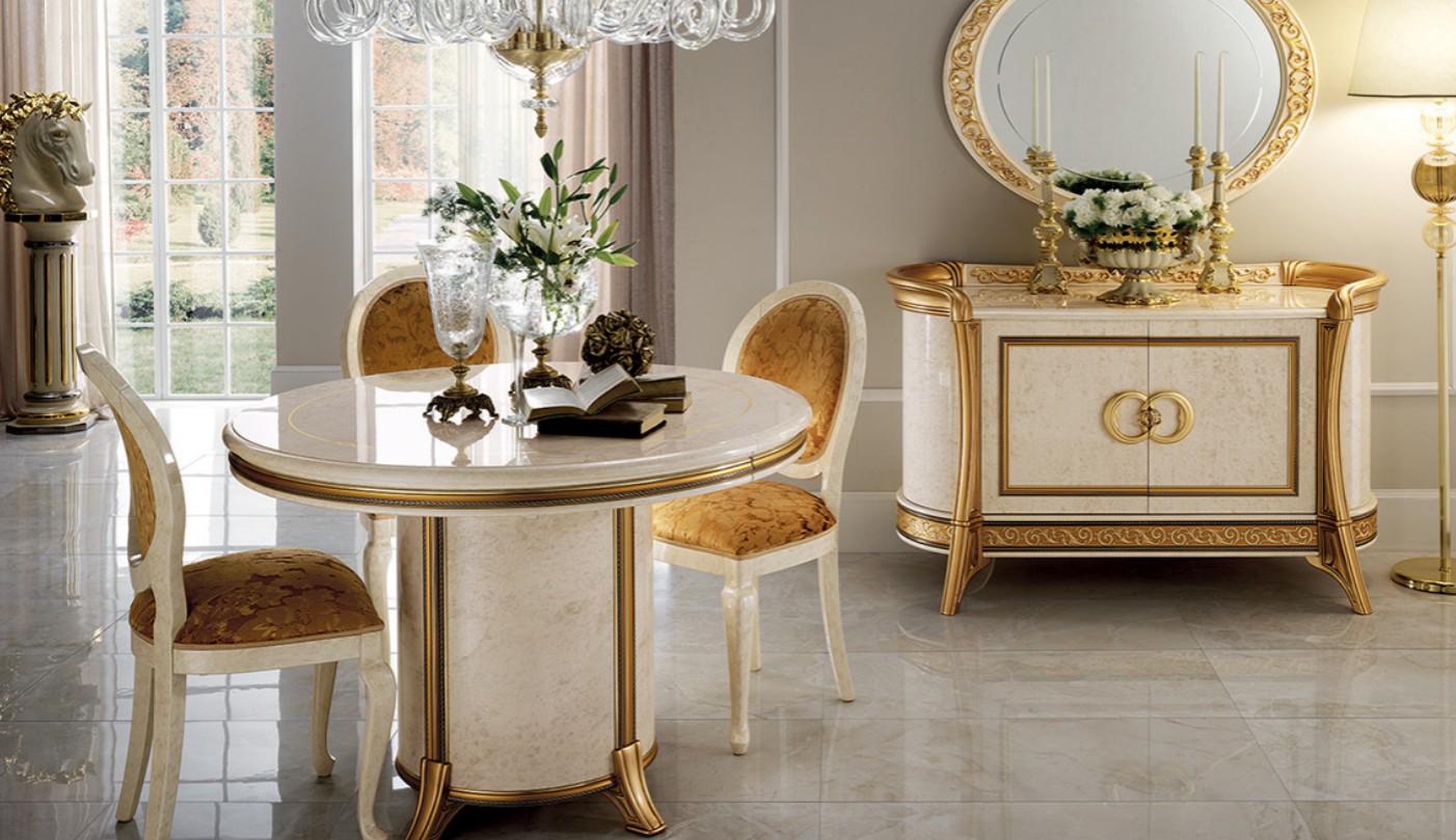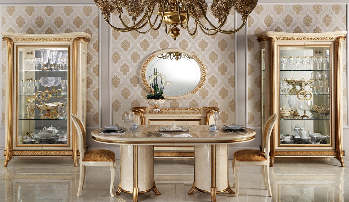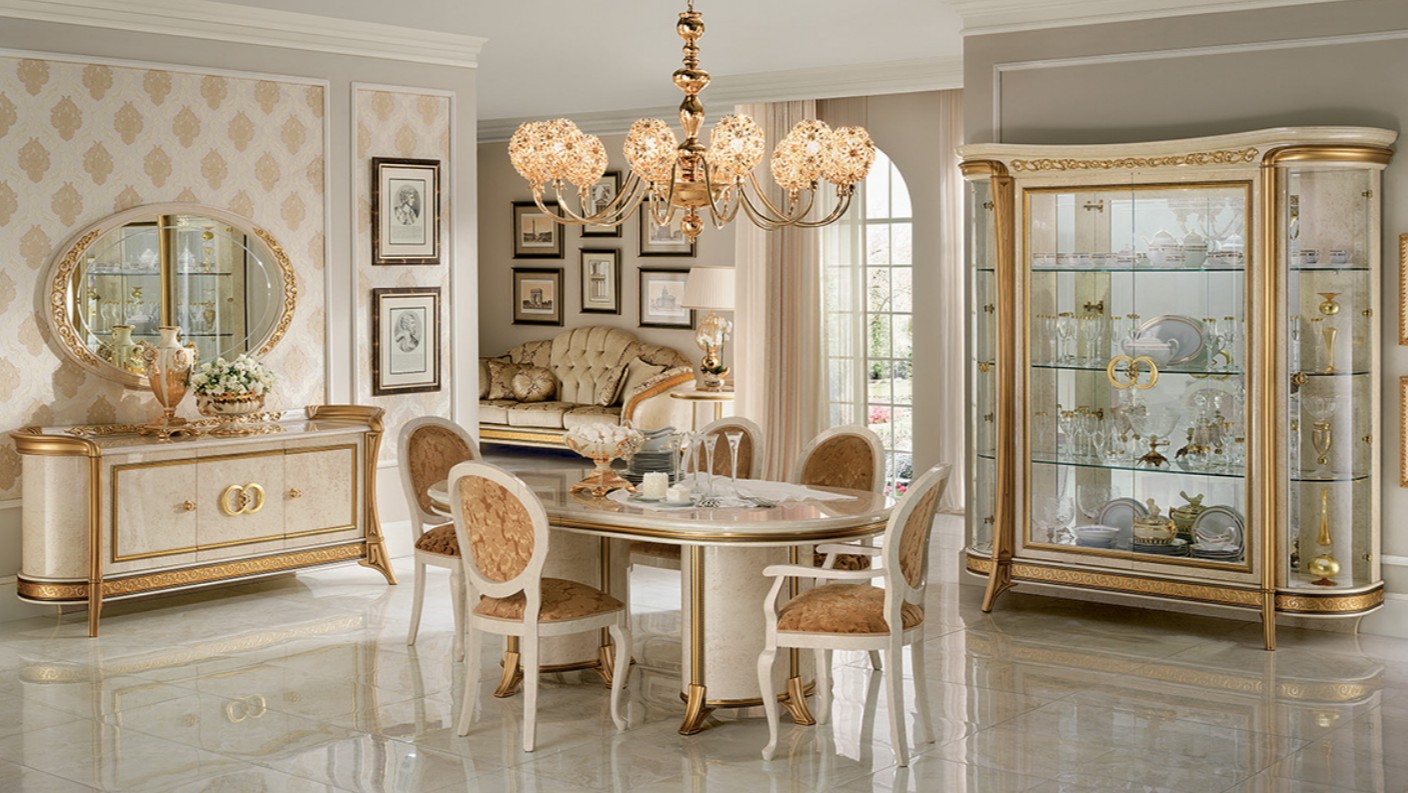Столовая коллекции Мelodia является прекрасным сочетанием хроматического и стилистического качества. Каждый предмет отражает итальянский дух, источник вдохновения всех творений Arredoclassic. Каждая линия, каждая деталь и каждая позолоченная деталь внимательно придумана и реализована в сохранении качественных стандартов на максимальном уровне, чтобы гарантировать не только приятную атмосферу но также место в котором провести время.