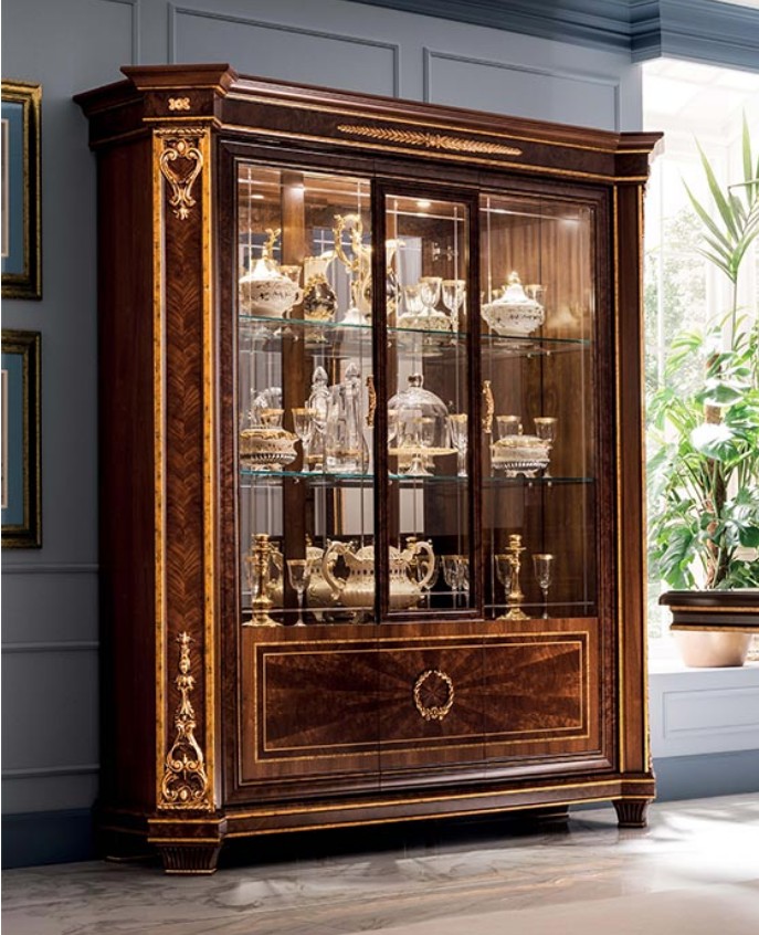 Наши витрины Modigliani предназначены для удовлетворения эстетических и пространственных потребностей. Этому неоклассическому дизайну придают еще большее значение и элегантность его колонны в стиле ампир со вставками из красного дерева, изогнутыми мотивами сусального золота и изысканными аппликациями ручной работы. Доступный с одной, двумя или тремя дверями, этот изысканный предмет мебели гарантированно впишется в любое пространство.
