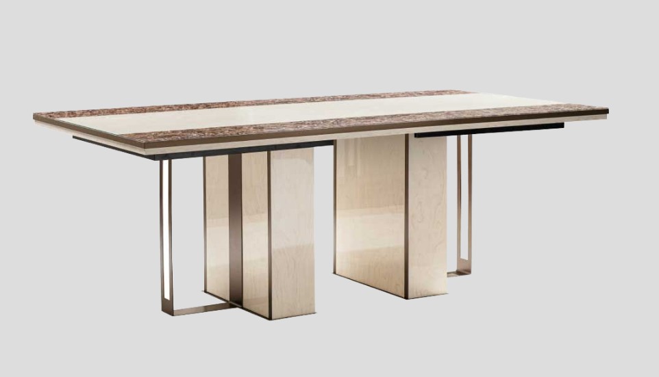 Глянцевая столешница столов Poesia (доступна в размерах 160 и 200 см, а также в раздвижной версии с боковыми расширениями на 40 см каждая) перекликается с отделкой и цветовой гаммой столешницы буфета и витрин.