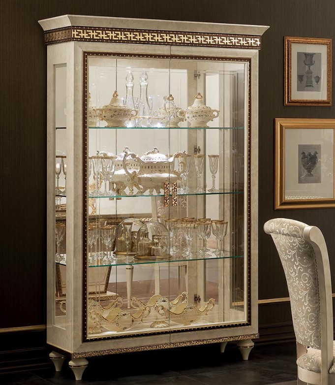 Витрины для столовой коллекции Fantasia обеспечивают отличный свет для окружающей среды благодаря контрасту между бронзовыми зеркальными дверцами и золотыми хромированными эффектами центрального фриза. Доступный в трехдверной, двухдверной или даже однодверной версии, он добавляет дополнительную ценность и освещает столовую Fantasia.