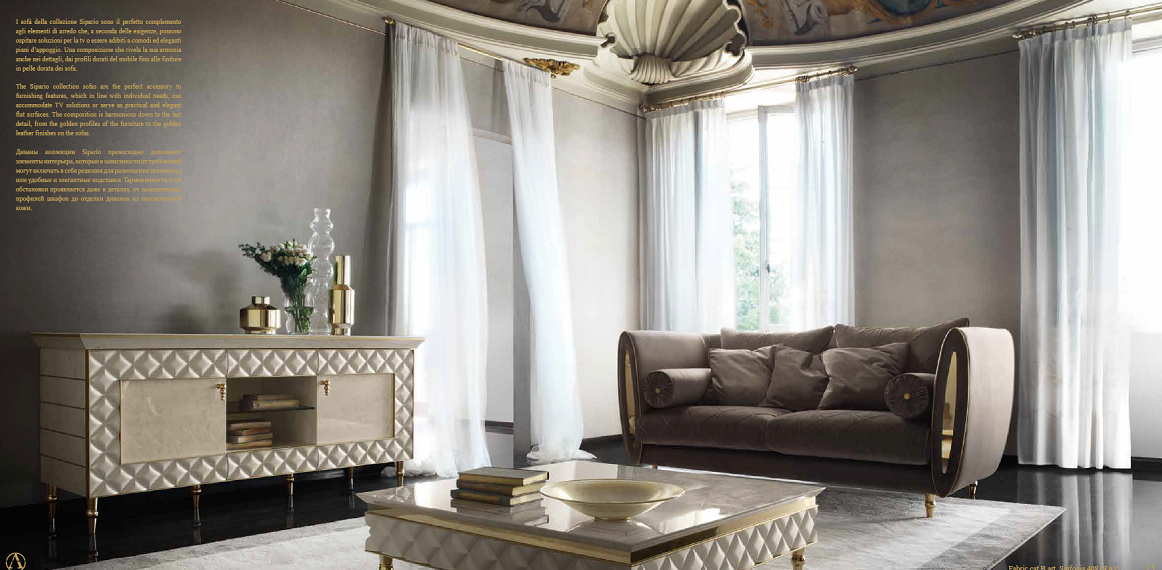 Предметы, составляющие обстановку гостиной Sipario, задуманы, чтобы сделать это дневное пространство одним из самых престижных и одновременно очаровательным. Тонкая эксцентричная нить направляет дизайн этой коллекции, ее главная ценность заключается в ее сильном и утонченном характере. Мягкие и извилистые изгибы дивана и кресел - прекрасный пример их стеганой набивки ярких цветов. Выбор стиля, который поражает своей идеальной гармонией между формами, напоминает о прошлом, которое живет в нашем воображении, и композиционные решения, идеально соответствующие потребностям публики, которая любит демонстрировать свою индивидуальность: решительную, космополитичную и внимательную к деталям которые имеют значение.