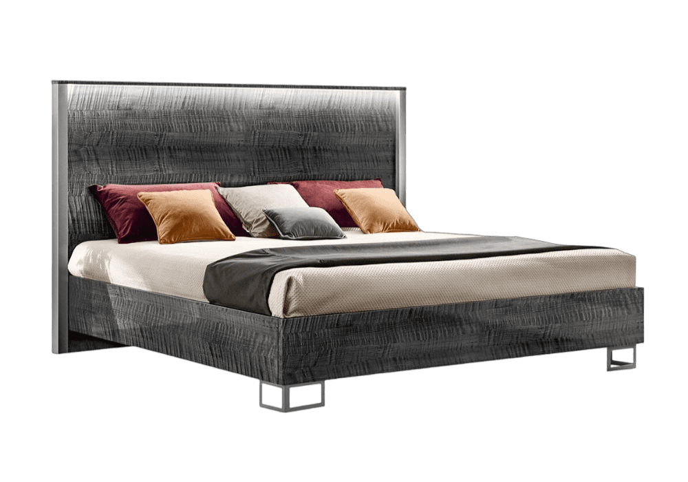 В центре внимания находится внушительное изголовье кровати со светодиодной подсветкой, которое создает мягкую, расслабляющую атмосферу. Не менее поразителен каркас, который ее окружает: благодаря титановой отделке, повторяющей квадратные ножки и ручки, она придает минимализму спальни нотку стиля и роскоши.