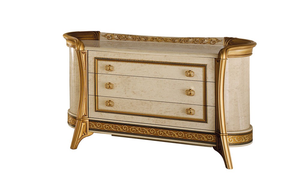 Дизайн комода - не исключение, подчеркивается сладость эллиптической геометрии, которая вдохновляет большинство предметов. Декоративные колонны, золотые и элегантно изогнутые в центре, характеризуют фасадную часть в интересной и изысканной гармонии.