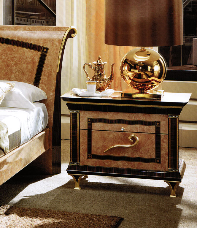 Тумбочка прикроватная выполнена из массива дерева в неоклассическом стиле. Боковые панели декорированы контрастными вставками. Дверца декорирована элементом ручной работы из сусального золота. Ножки покрыты сусальным золочением.