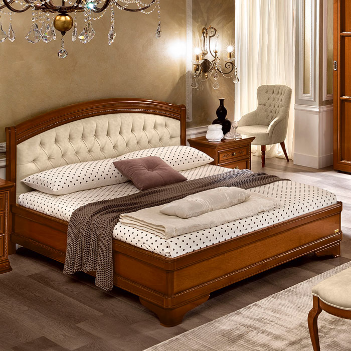 Кровати TORRIANI изготавливаются как с низким изножьем, так и со стандартным. Низкое изножье, изготовленного из ясеня, имеет на лицевой стороне ажурный узор, нанесенный вручную методом интарсии итальянским орехом. Кровати с низким изножьем декорированы характерным для коллекции узором, выполненным горячим тиснением. Кровать опирается на ножки, изготовленные из массива дерева.