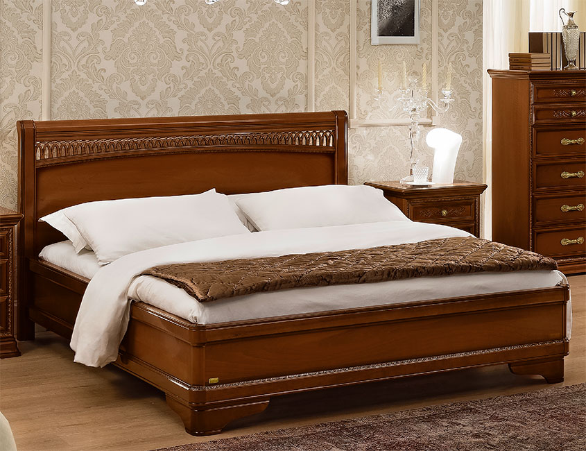 Кровати TORRIANI изготавливаются как с низким изножьем, так и со стандартным. Низкое изножье, изготовленного из ясеня, имеет на лицевой стороне ажурный узор, нанесенный вручную методом интарсии итальянским орехом. Кровати с низким изножьем декорированы характерным для коллекции узором, выполненным горячим тиснением. Кровать опирается на ножки, изготовленные из массива дерева.
